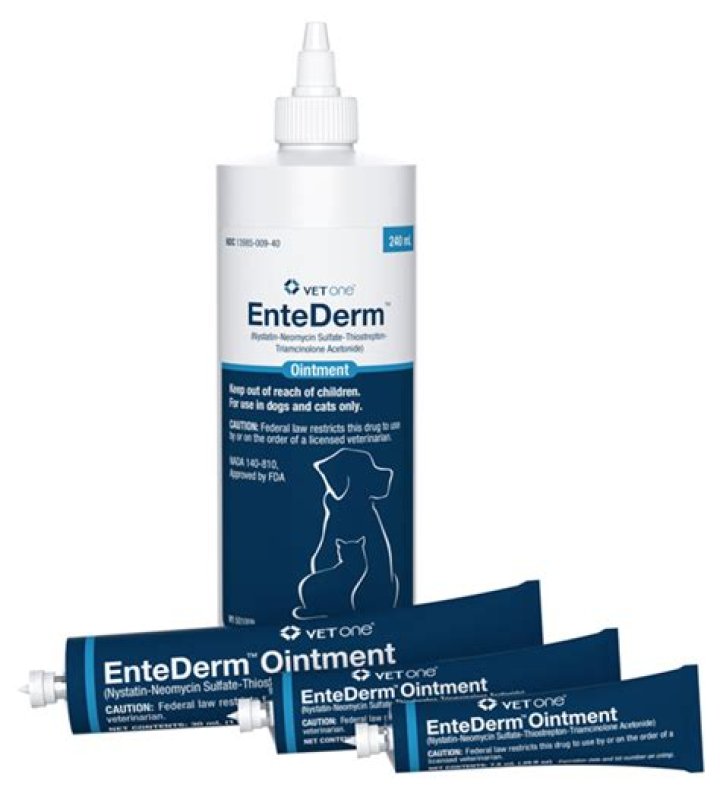 EnteDerm Ointment Indications Nystatin, neomycin sulfate, thiostrepton and triamcinolone acetonide ointment is particularly useful in the treatment of acute and chronic otitis of varied etiologies, in interdigital cysts in cats and dogs, and in anal gland infections in dogs.