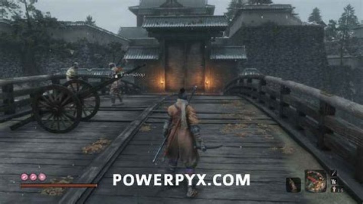 Ashina Castle grounds. To get started, leave the safety of the battlefield shrine and push open the giant gate in front of you, then head up the stairs. There’s an enemy just around the bend, so hug the rocks to the right as you climb the steps. Take him out, then grapple onto the roof of the building.