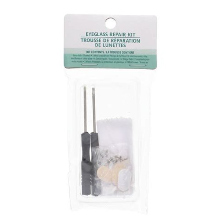 Glasses repair kits usually include miniature screws of various commonly used kinds, specialty sized extra small screwdrivers and sometimes angled tweezers to make gripping the little pieces easier.