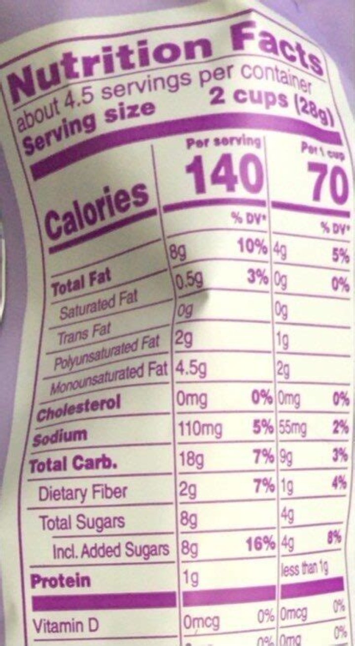 Cost per serving calculator Nutrition Facts Total Carbohydrates: 19 g 7% Dietary Fiber: 3 g 11% Sugars: 0 g Protein: 2 g.