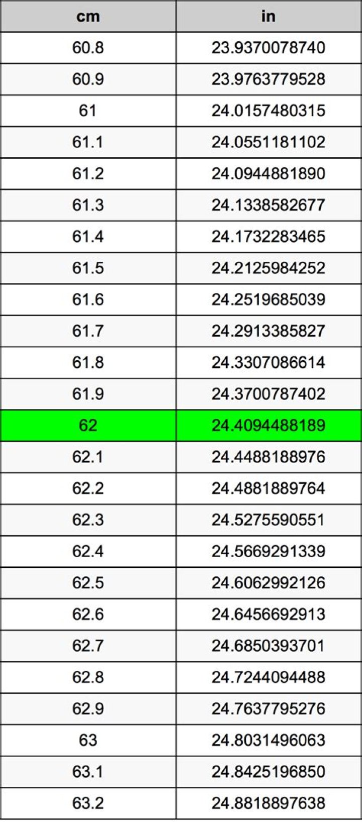 More Heights CM In 61 24.015748031496 inches 62 24.409448818898 inches 63 24.803149606299 inches 64 25.196850393701 inches.