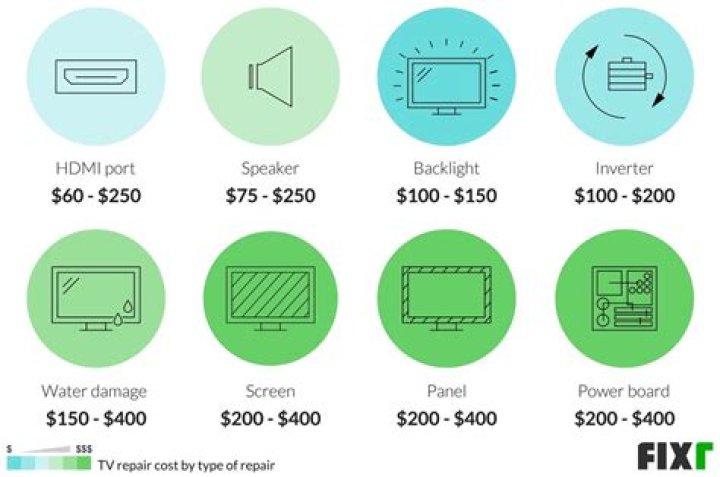 The average cost to repair a TV is $207, with most repairs ranging from $60 to $350. Common TV fixes include replacing a motherboard or power supply for $250, bulb replacement for $88, HDMI port for $200, or backlight repair for $111. TV repair shops charge $60 to $125 per hour.