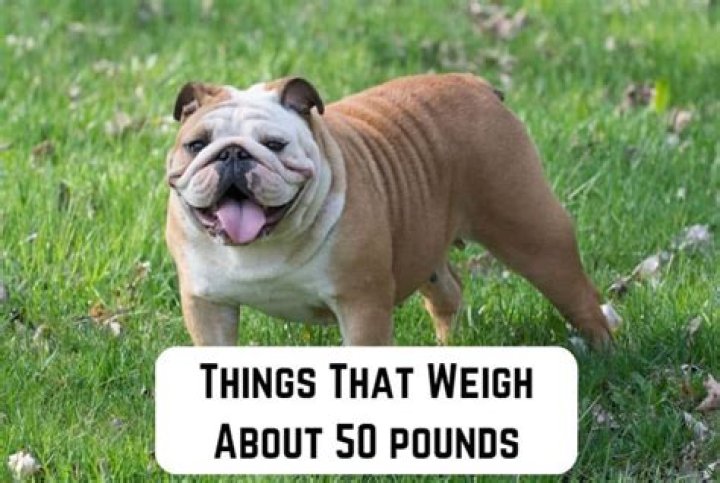 10 Common Items That Weigh About 50 Pounds A Large Bag of Dog Food. Fast-Setting Concrete Mix. A Small Bale of Hay. An average Male bulldog. Small size mattresses. A bag of potatoes. Steel Front Panel Refrigerator (by Bull outdoor products) 50-gallon drum of KY jelly.