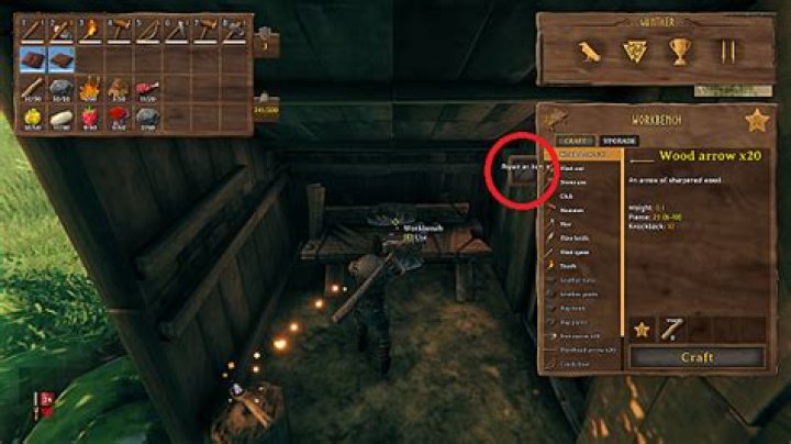 When the bar flashes red, you won’t be able to use it anymore and you need to take it to a workbench to repair it. Interact with the workbench and simply click the hammer icon to the left of the right workbench box, highlighted above. You also don’t need any resources to repair an item in Valheim, it’s completely free.