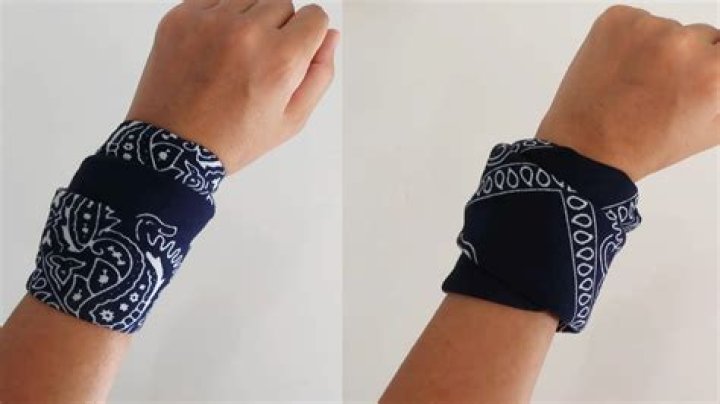 The Wrist Piece Fold the bandana diagonally to increase the length; it should look like a triangle. From the center of the bandana, begin folding. Wrap around your wrist a few times. Enlist your roommate or friend to tie it behind the wrist and tuck the ends into the folds of fabric.