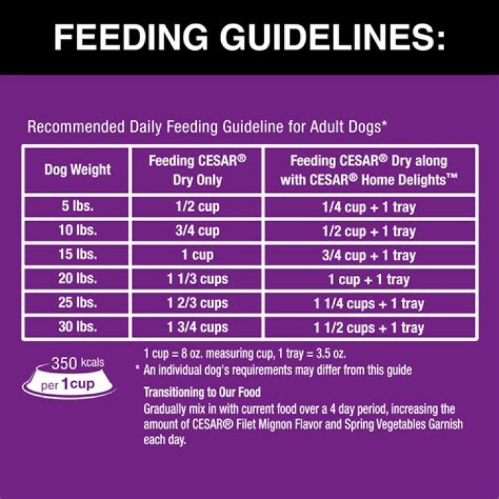 CESAR Canine Cuisine Wet Dog Food also uses quality ingredients formulated to meet nutritional levels established by the AAFCO dog food nutrient profiles for growth. Feed a puppy one-half to two trays per five pounds body weight, twice a day.