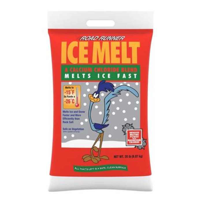 Road Runner ice melt is an enhanced calcium chloride blend that melts snow and ice fast. When used as directed, this product is safe to us on concrete that is more than one year old.