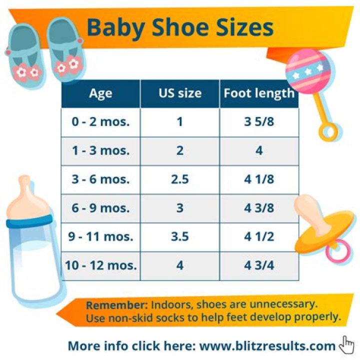The BirdRock Baby Shoe Size Chart Baby Shoe Size (US) Foot Length (Inches) Age 2.5 4.0″ 3-6 Months 3 4.125″ 3-6 Months 4 4.5″ 6-12 Months 5.5 5.0″ 12-18 Months.