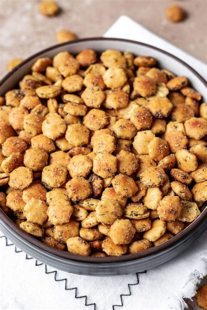 Oyster crackers can be substituted with any other type of crackers such as saltines, cheez-its, or Goldfish crackers.