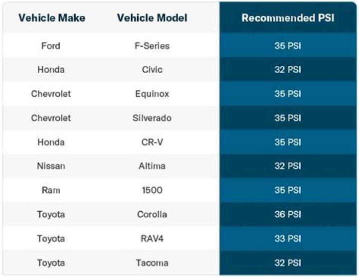 Air pressure in tires is measured in pounds per square inch, or PSI; usually, the recommended pressure ranges between 30 and 35 PSI.