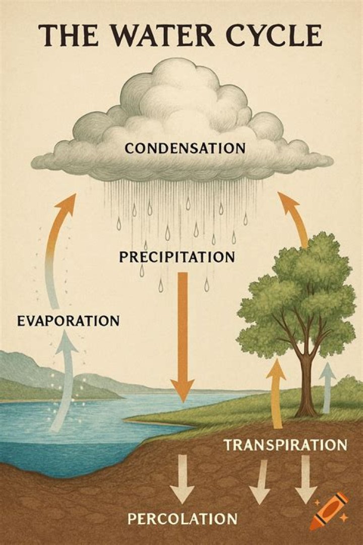 Liquid water evaporates into water vapor, condenses to form clouds, and precipitates back to earth in the form of rain and snow. Liquid water flows across land (runoff), into the ground (infiltration and percolation), and through the ground (groundwater).