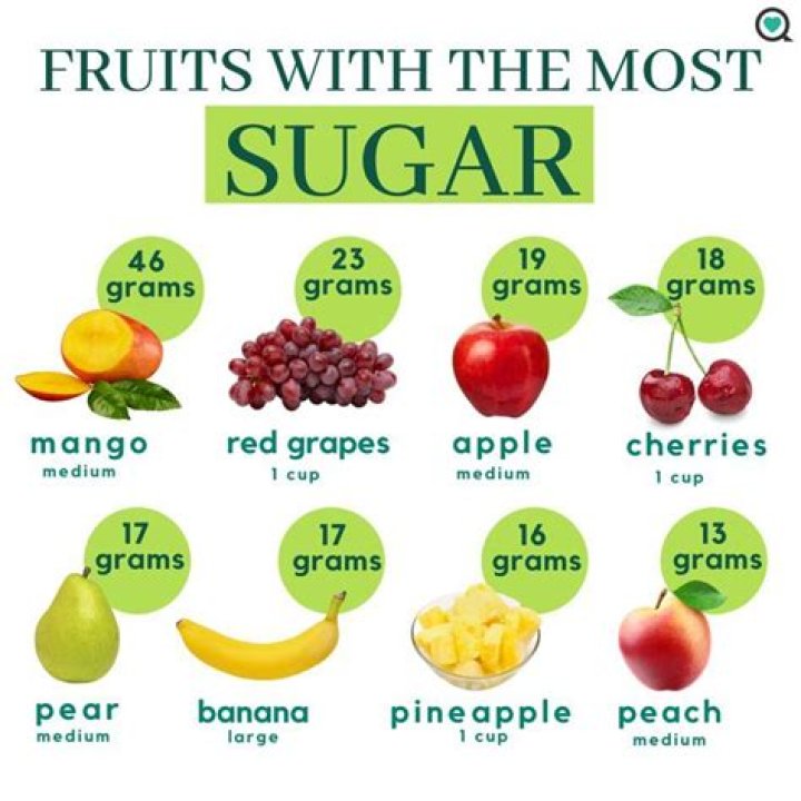 Which Fruits Have the Most Sugar? Scroll down to read all. 1 / 13. Mangoes. 2 / 13. Grapes. A cup of these has about 23 grams sugar. 3 / 13. Cherries. They’re sweet, and they have the sugar to show for it: A cup of them has 18 grams. 4 / 13. Pears. 5 / 13. Watermelon. 6 / 13. Figs. 7 / 13. Bananas. 8 / 13. Less Sugar: Avocados.