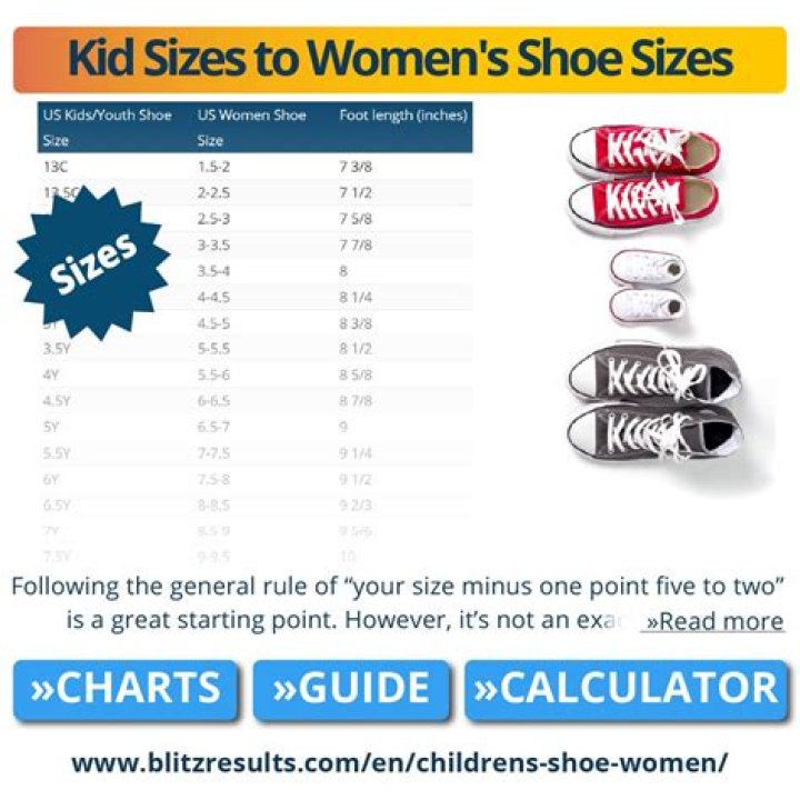 Step 5: Use the below kids’ shoe size to women’s size chart to determine your correct size. Women’s Size Kids’ Size 8 6 8.5 6.5 9 7 9.5 7.5.