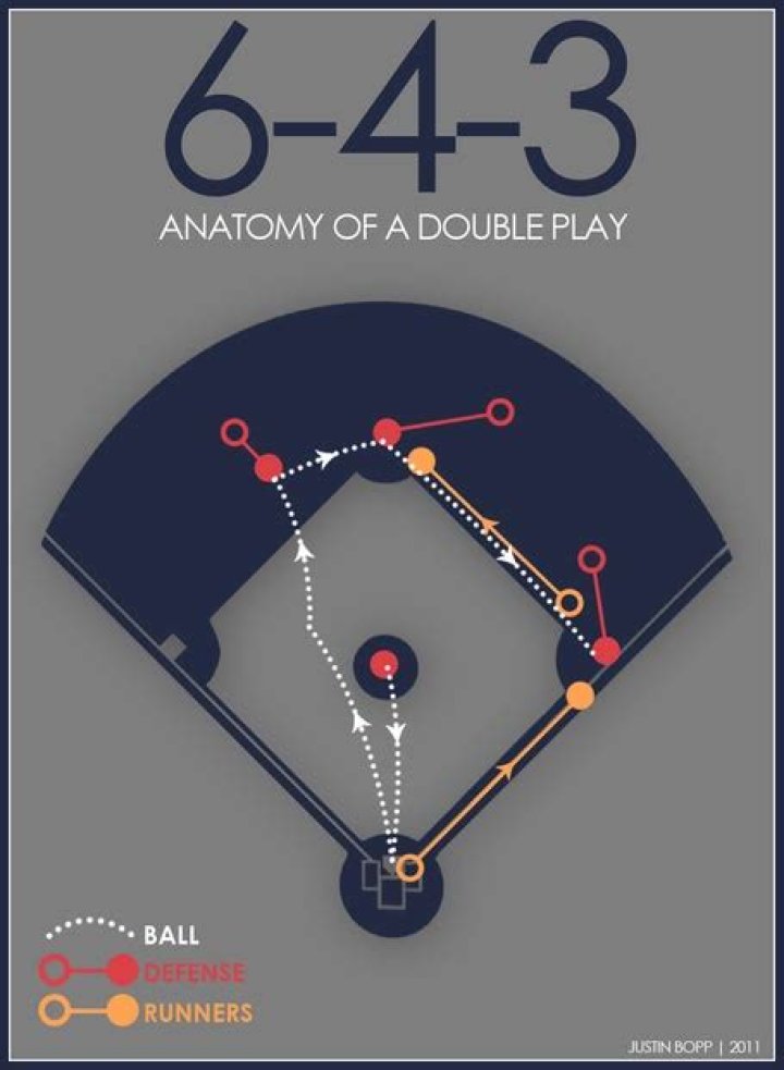 6-4-3 double play The shortstop (6) fields a batted ball and throws to the second baseman (4), who forces out a runner advancing from first and then throws to the first baseman (3) to force out the batter.