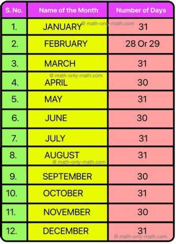 The 12 Months January – 31 days. February – 28 days in a common year and 29 days in leap years. March – 31 days. April – 30 days. May – 31 days. June – 30 days. July – 31 days. August – 31 days.