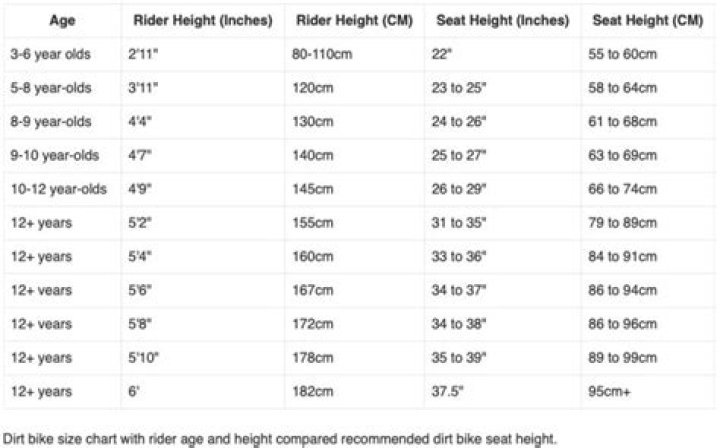 Dirt Bike Size Chart (cc) vs Dirt Bike Height Chart HEIGHT IN FEET (Person) HEIGHT IN cm (Person) DIRT BIKE ENGINE CAPACITY (CC) 10-12 years old kids 143 110/125 8-9 years old kids 133 110 9-10 years old kids 140 110 5’2” 157 125.