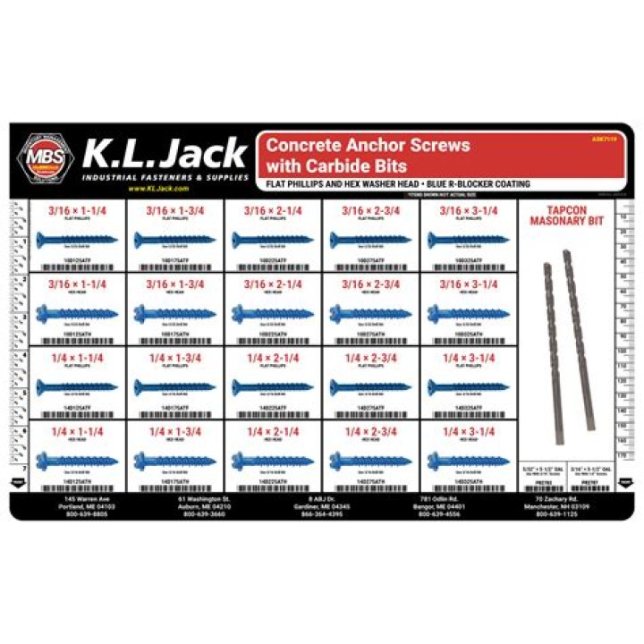 The 3/16” diameter masonry screw requires the use of 5/32” carbide tipped bit for drilling the hole.