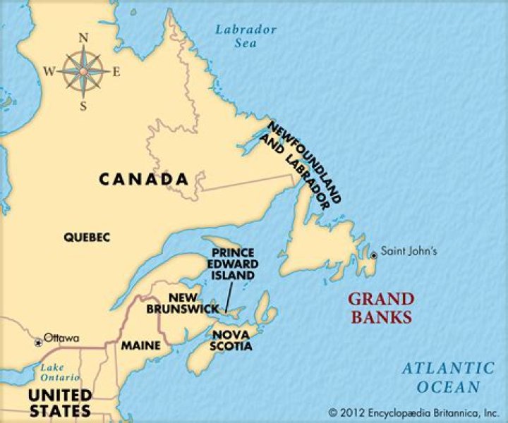 Grand Banks, portion of the North American continental shelf in the Atlantic Ocean, lying southeast of Newfoundland island, Canada. Noted as an international fishing ground, the banks extend for 350 miles (560 km) north to south and for 420 miles (675 km) east to west.