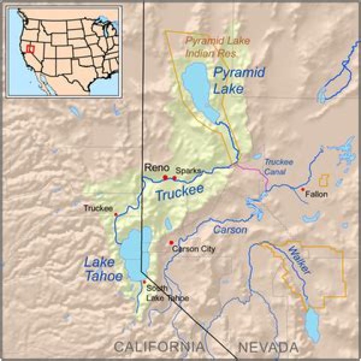From it headwaters high in California’s Sierra Nevada, the Truckee River flows into and through Lake Tahoe, continuing down the Truckee River canyon to the Reno metropolitan area and then across miles of Nevada high desert before flowing into Pyramid Lake, 40 miles northeast of Reno.