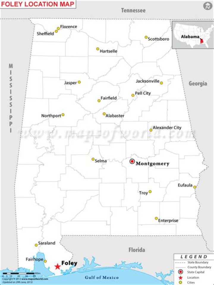 Foley is a small city in the state of Alabama which is located in the county of Baldwin. Living in Foley has a suburban feel, which can be nice for families looking for more space than larger densely packed cities for the money and a good area to raise children.