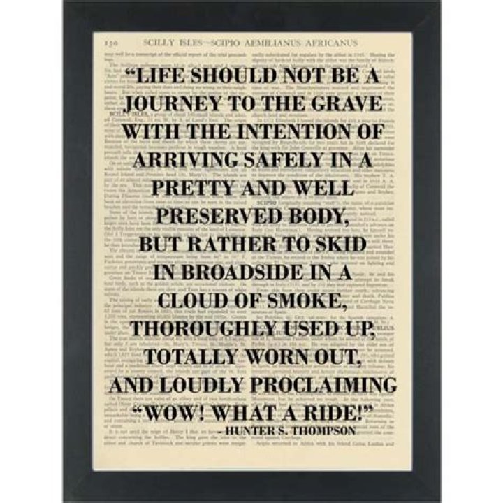– Hunter S Thompson “Life should not be a journey to the grave with the intention of arriving safely in a pretty well preserved body, but rather to skid in broadside ina cloud of smoke, thoroughly used up, totally worn out, and loudly proclaiming, Wow! What a Ride!” Wooden Plaque.