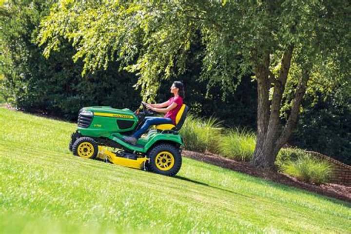 THE X380. The John Deere X380 offers large wheels and tires, a 22HP engine, and a 54-in. deck option, all of which make this riding mower capable of tackling uneven terrains and sloped lawns. The X380 also has a strong transmission that makes climbing hills and towing a trailer safe and easy to accomplish.