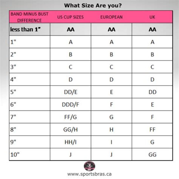 If your bust size is less than 1 inch bigger than your band size, you’re a cup size AA. 1-inch difference = A. 2-inch difference = B. 3-inch difference = C.