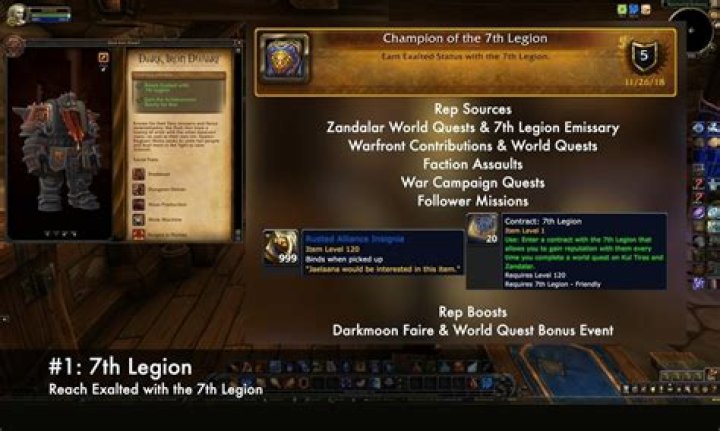 7th Legion is a new faction added in Battle For Azeroth. Vindicator Jaelaana is the 7th Legion emissary an can be found in Boralus Harbor. She stands on the top of stairs that head to Aliance ship, where mission table is. # 7 Side Alliance Faction 7th Legion Zone Tiragarde World Quest Alliance War Effort.