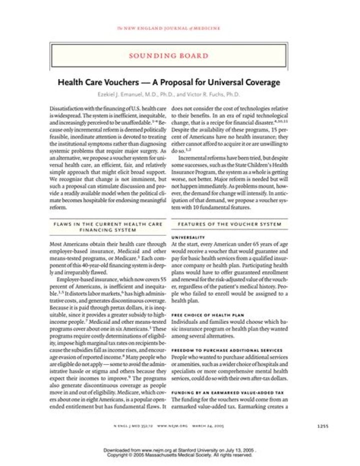 The Universal Healthcare Voucher System (UHV) achieves universal health coverage by entitling all Americans to a standard package of benefits comparable to that received by federal employees.