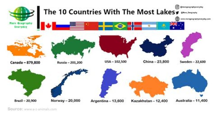 10) Australia – 11,400 Many coastal lagoons and natural inland lakes also exist, as do numerous ephemeral salt lakes within the central flat desert regions. Lake Eyre, the largest lake in Australia covers 9,500 sq km (3,668 sq mi) is a 1/3 larger than the largest lake in all of Europe.