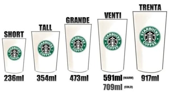 At Starbucks around the world, the options are: short (8 ounces), tall (12 ounces), grande (16), venti (24), and trenta (31). This designation by the coffee company is considered by many to be a classic instance of corporate language manipulation.