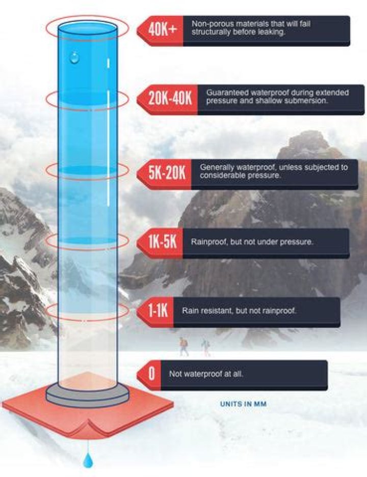 The higher the column of water, the more waterproof the garment is. So, if the column of water measures 10,000mm before the water penetrates the material, it has a rating of 10k waterproofing.