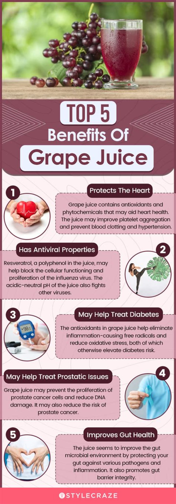 Grape juice has antiviral properties because it has so much vitamin C. Vitamin C is an antioxidant with antiviral effects that can stop viruses responsible for stomach bugs, but grape juice does not have enough vitamin C to stop or prevent a stomach flu.