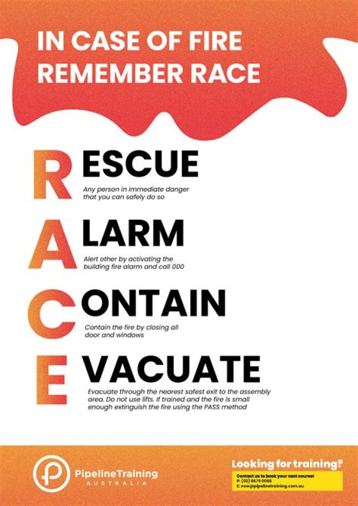 Fires create panic and confusion. While your workplace or healthcare team may already be trained in your organisation’s fire plan, parts of it can often be lost in the panic of the moment if a fire emergency really does arise. The RACE acronym simply stands for: Remove, Alarm/Alert, Confine, Extinguish/Evacuate.