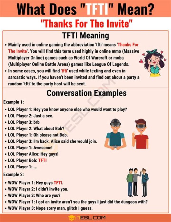 TFTI is a texting and social-media acronym that means thanks for the invite, and is usually used sarcastically, when someone has not been invited. It might also be used to mean thanks for the info.